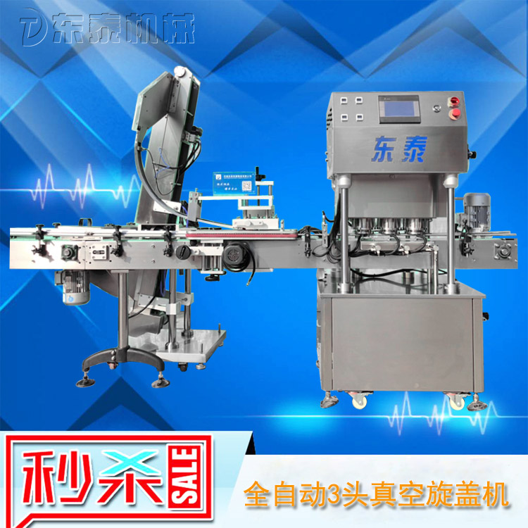 該直線式真空旋蓋機(jī)是東泰機(jī)械結(jié)合用戶使用的情況,摒棄了傳統(tǒng)轉(zhuǎn)盤式真空旋蓋機(jī)的弊端,研制開發(fā)的新型高效設(shè)備,設(shè)備自動檢測到兩個(gè)瓶子蓋子進(jìn)入到雙頭真空旋蓋機(jī)內(nèi),旋蓋機(jī)彩色顯示屏?xí)?shí)時(shí)顯現(xiàn)旋蓋狀況,整機(jī)多點(diǎn)檢測,當(dāng)進(jìn)口無瓶無蓋、出口堵塞、定位不準(zhǔn)、瓶身傾倒均自動停機(jī)。單個(gè)旋蓋頭達(dá)到的真空度都可以單顯示,單調(diào)整