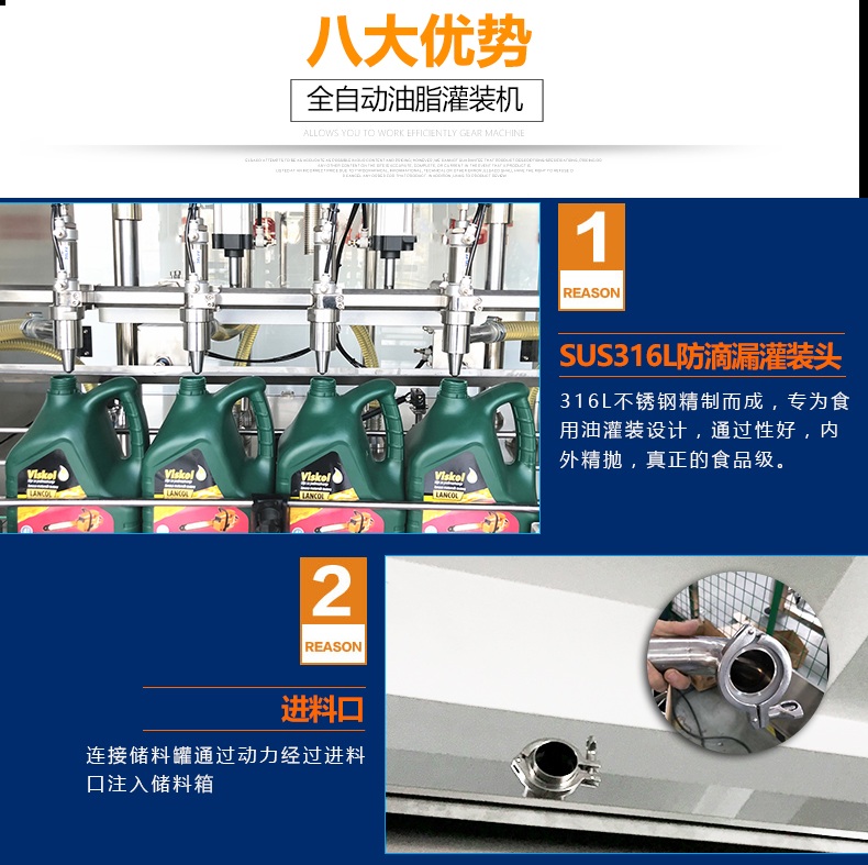 1.防滴漏灌裝頭由SUS316L不銹鋼精制而成,專為食用油灌裝設(shè)計(jì),通過(guò)性好,內(nèi)外精拋,真正的食品級(jí).