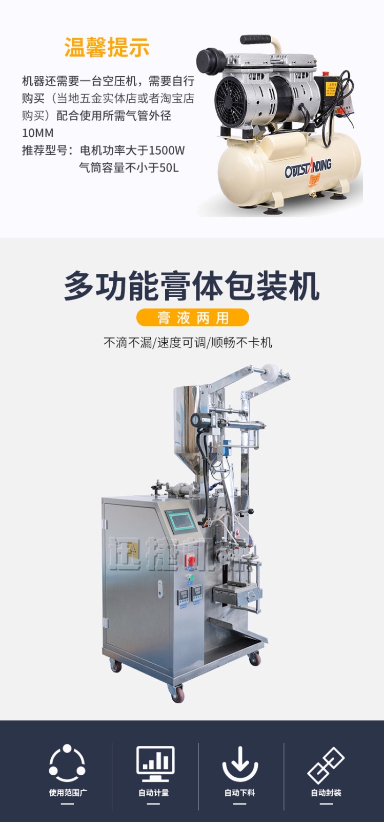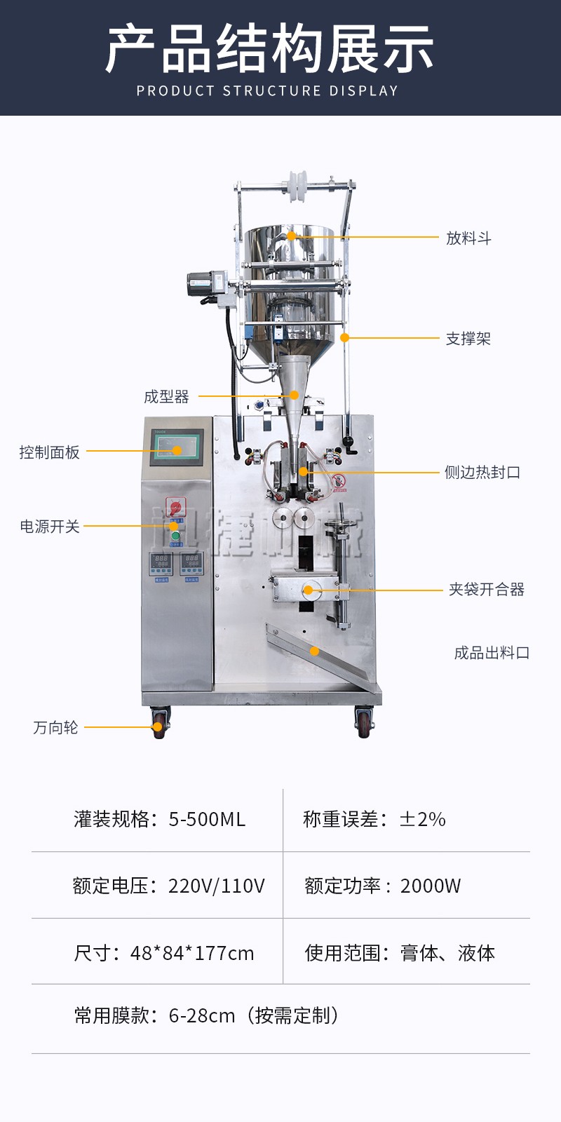 光電跟蹤及無極調(diào)速于一體,可周期完成下料、計量、日期打印、制袋、充填、封合、熱壓批號、分切計數(shù)等作業(yè)。