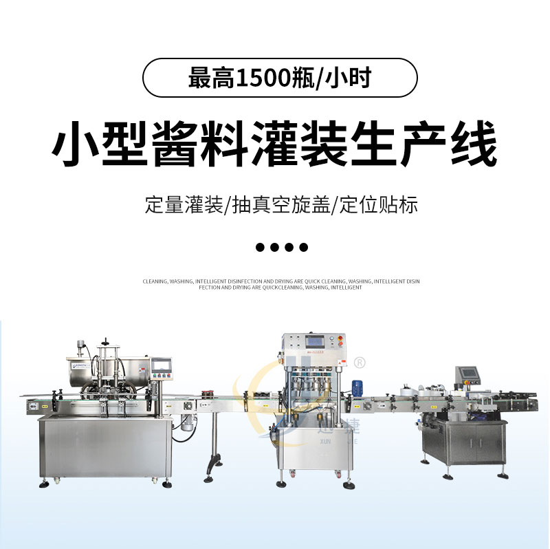 小型醬料灌裝生產(chǎn)線適用于調(diào)味品中帶顆粒并且濃度較大的香菇醬、辣椒醬、豆瓣醬、花生醬、芝麻醬、果醬、牛油火鍋底料