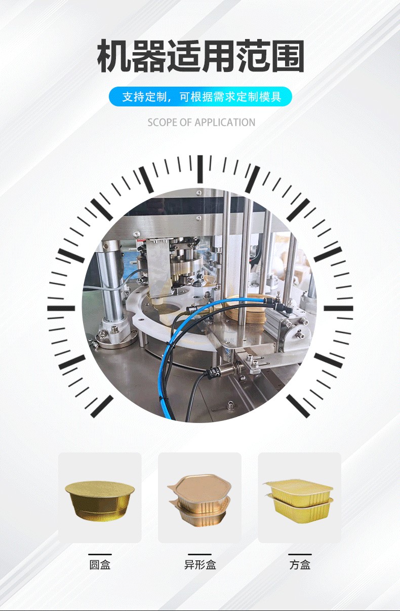 全自動鋁箔盒封口機(jī)用途:用于咖喱醬、調(diào)料品、火鍋料、果醬、辣椒醬、醬油醋、番茄醬等杯盒的自動灌裝與封口。
