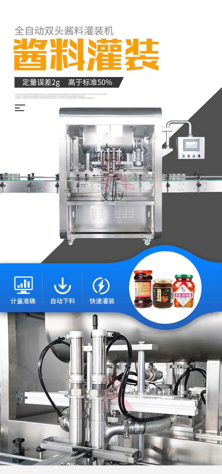 雙頭醬料灌裝機適用于調(diào)味品中帶顆粒并且濃度較大的香菇醬、豆瓣醬、花生醬、芝麻醬、果醬、牛油火鍋底料等醬類的灌裝。