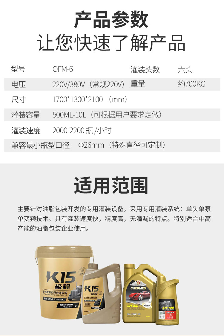全自動六頭稱重潤滑油灌裝機主要針對油脂包裝開發(fā)的專用灌裝設備。采用專用灌裝系統(tǒng):單頭單泵單變頻技術。具有灌裝速度快