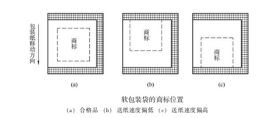 在包裝作業(yè)過程中,卷筒半徑逐漸減小,包裝紙所受張力發(fā)生變化,送紙輥與包裝紙之間的摩擦因數(shù)受環(huán)境溫濕度的影響而發(fā)生波動(dòng),加上商標(biāo)印刷誤差,以及送紙、縱封、橫封、切斷各部分速度的差異等因素,使得刀輥的實(shí)際切線偏離規(guī)定部位。即使這種位置誤差很小,例如在某—包裝袋上只偏差0.1mm,但包裝機(jī)速度很快,有的高達(dá)200包/min, 如不加以控制調(diào)節(jié),機(jī)器運(yùn)行1垃i六 后,誤差積累可達(dá)20mm,切線嚴(yán)重偏離規(guī)定部位,降低了包裝質(zhì)量,甚至造成廢品。如圖所示,圖(a)為合格品; 圖 (b) 為送紙速度偏低,商標(biāo)后移; 圖 (c) 為送紙速度偏高, 商標(biāo)前移。 為了保證包裝袋的正確封切, 必須在卷筒紙供送系統(tǒng)中, 引人商標(biāo)圖案自動(dòng)位置檢測與控制系統(tǒng)。目前應(yīng)用廣泛的是光電自動(dòng)定位系統(tǒng)。