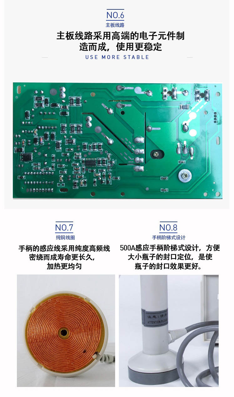 本機(jī)采用國外先進(jìn)線路,選用日本新模塊化功率器件,較于一般電子感應(yīng)加熱器更省電,熱效率達(dá)到90%以上,瞬時(shí)加熱速度為后者的20-30倍,因此不僅 適用于熱封性能較好的聚乙烯、聚丙烯材質(zhì)的瓶體,而且對(duì)熱封性能較差的聚酯瓶、玻璃瓶也有極好的封口效果。